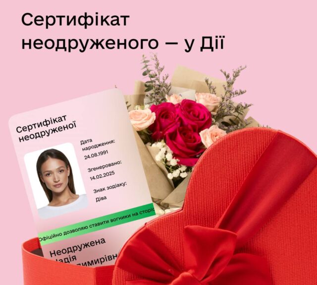 До Дня святого Валентина Мінцифра представила нову цифрову фішку – Сертифікат неодруженого чи неодруженої. Цей документ підтверджує, що користувач офіційно не перебуває у шлюбі, адже дані підтягнуті безпосередньо з реєстру ДРАЦС. Про це повідомляється у телеграм каналі Сервісу державних послуг “Дія”