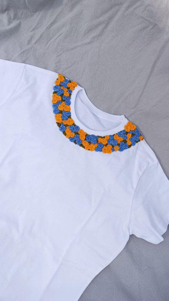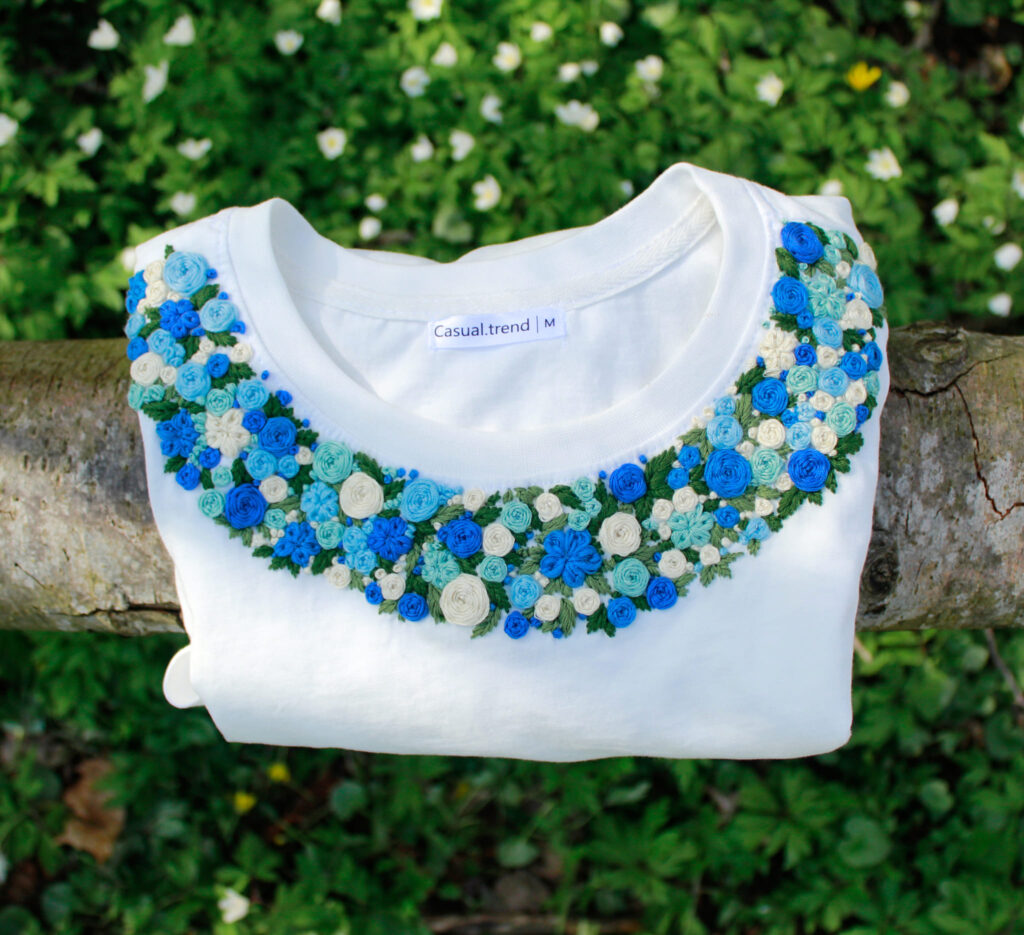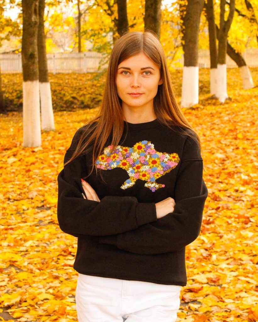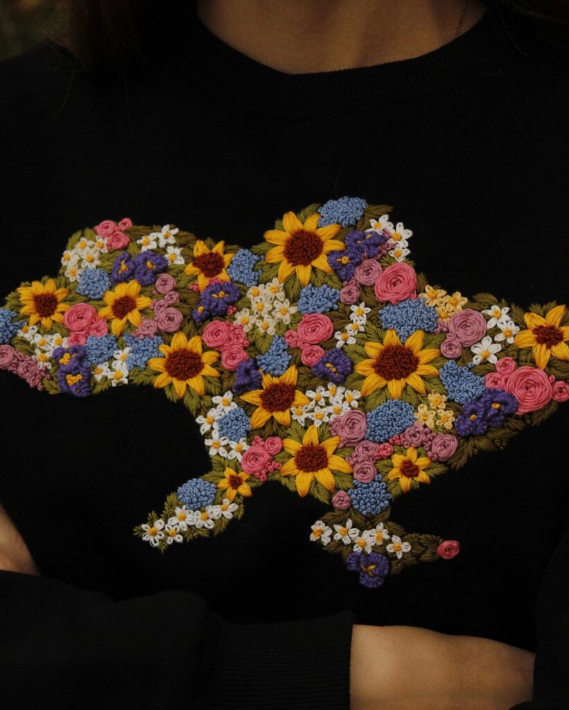 Вона вишиває футболки, свіншоти та худі. Для цього вигадала власний квітковий принт, об‘єднавши різні елементи – французький вузлик, гладь (квітку та листок), завдяки чому вишивка виходить об‘ємна, фактурна, текстурна і дуже цікава на дотик.