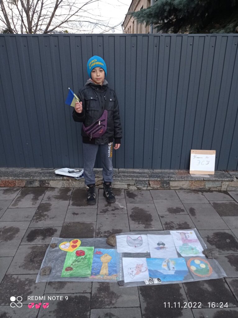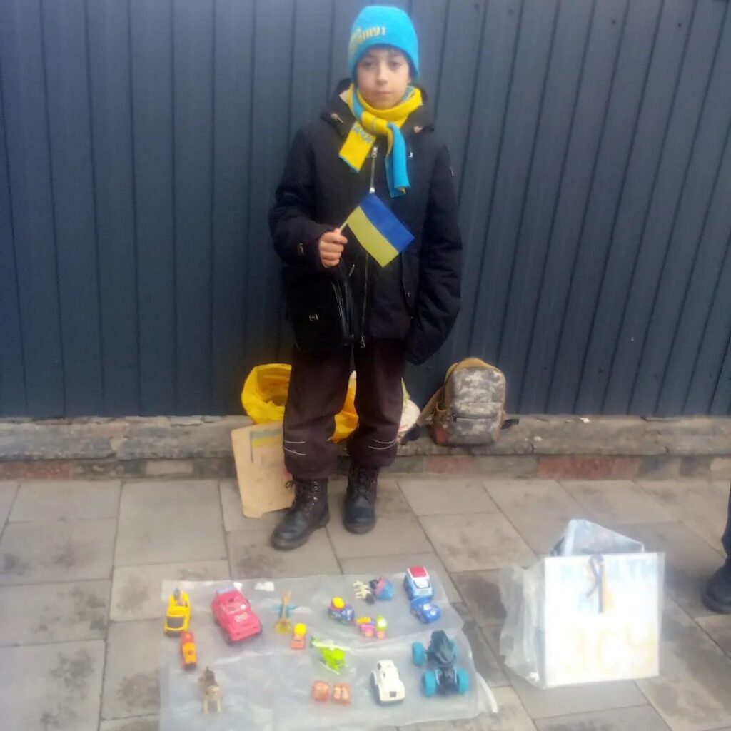Юного волонтера видно здалеку – на плечах прапор України, в руках табличка про збір на підтримку ЗСУ, поряд музична колонка. Ті, хто кидають у скриньку кошти, можуть на власний розсуд обрати у подарунок іграшку із автоколекції хлопчика, яку він збирав у дитинстві. Раніше також з благодійною метою продавав свої малюнки. Багато хто просив на згадку лишити на них кілька слів або автограф.
