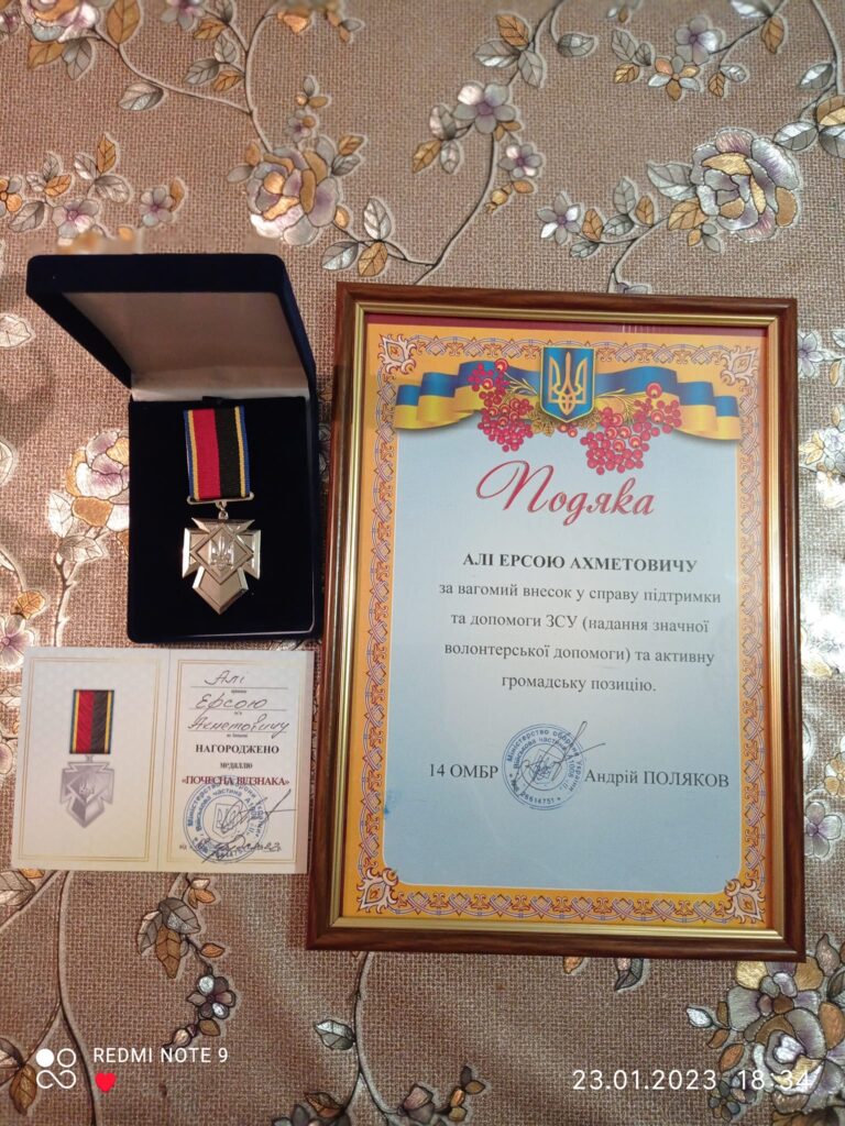 З свою активну позицію та волонтерську діяльність Алі Ерсой вже навіть має подяки та медаль, а ще шеврон від бійців 1 окремої бригади спецпризначення ім.І.Богуна, допомогу яким відправляє протягом останнього часу. Втім, відзнаки лише мотивують його робити ще більше. Має чіткий намір не зупинятися аж до остаточної перемоги.