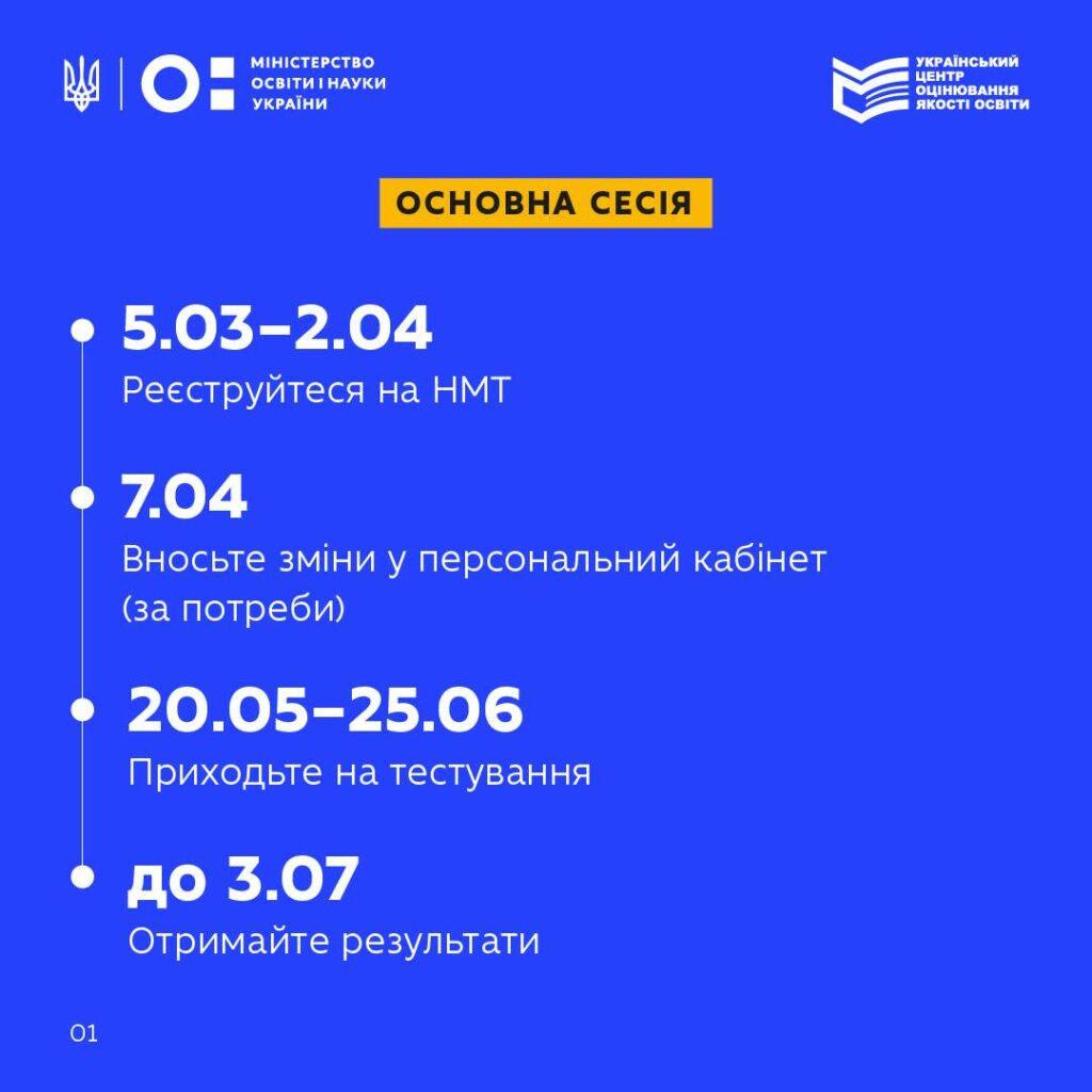 За даними Українського центру оцінювання якості освіти, основний період реєстрації для участі в основних сесіях НМТ триватиме з 5 березня до 2 квітня включно. До 7 квітня зареєстровані учасники зможуть внести зміни у своїх персональних кабінетах — зокрема змінити предмет додаткового блоку або населений пункт складання тесту.