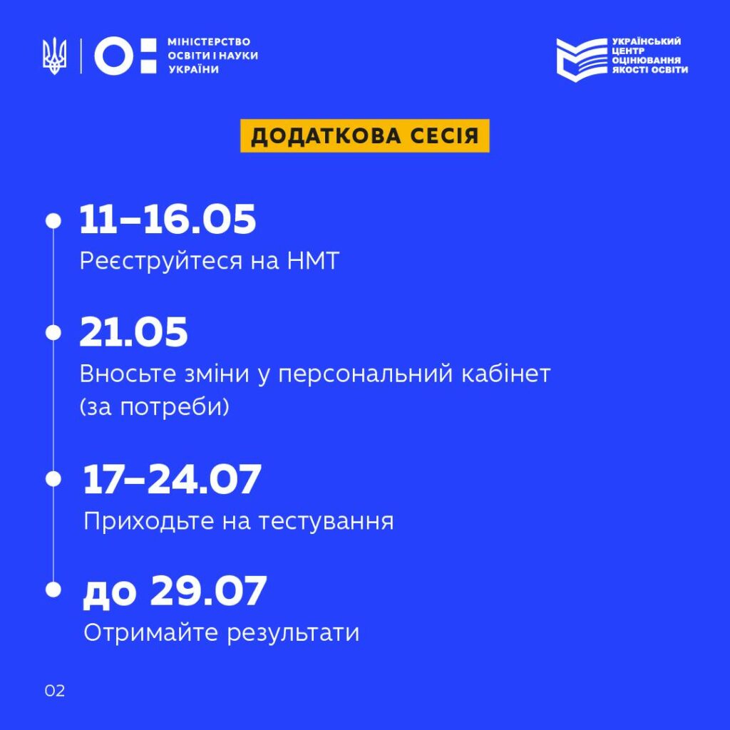 Основні сесії НМТ-2026 проходитимуть з 20 травня до 25 червня, а додаткові — з 17 до 24 липня. Результати основних сесій за шкалою 100–200 балів мають з’явитися в персональних кабінетах до 3 липня, додаткових — до 29 липня.