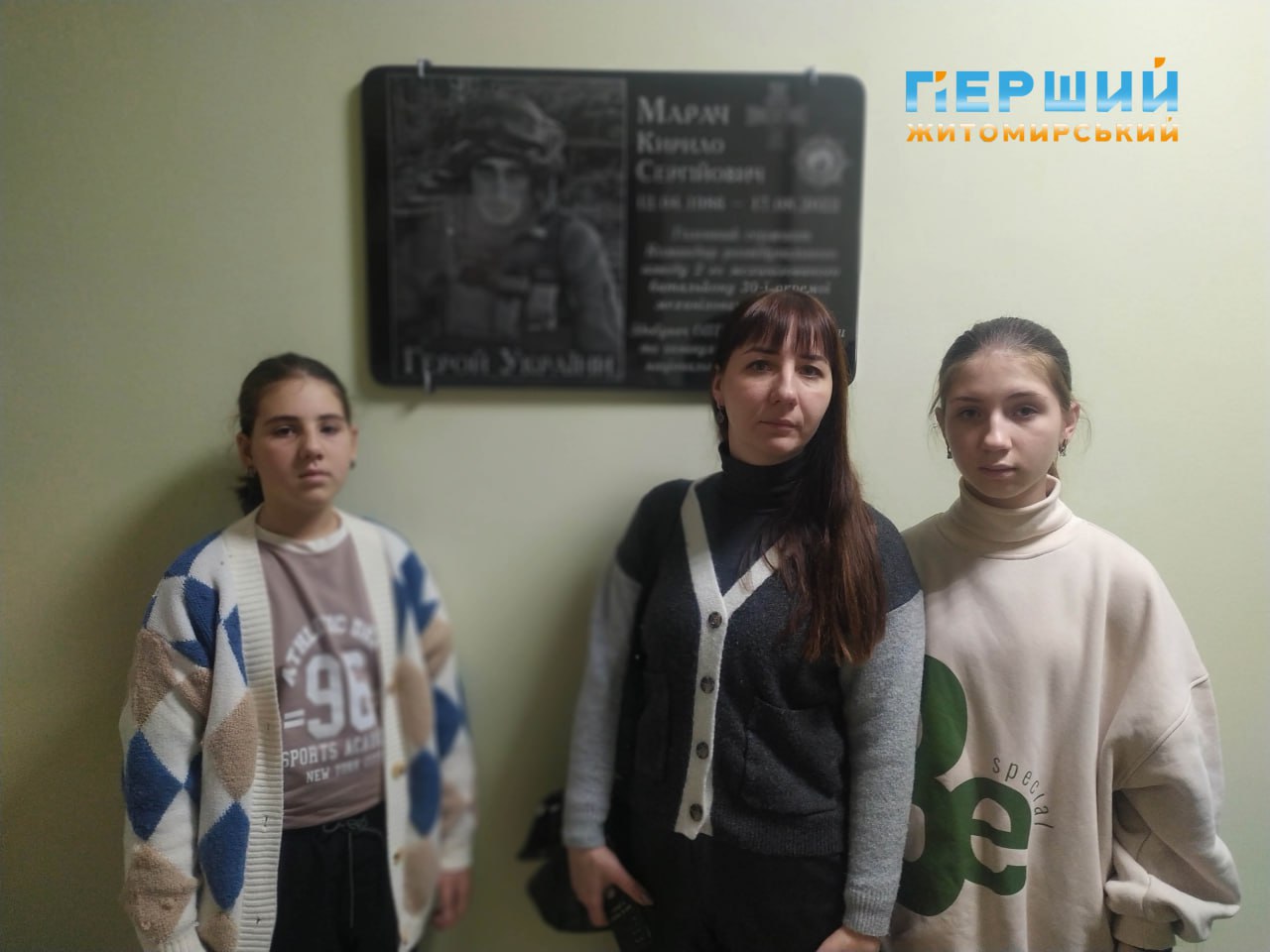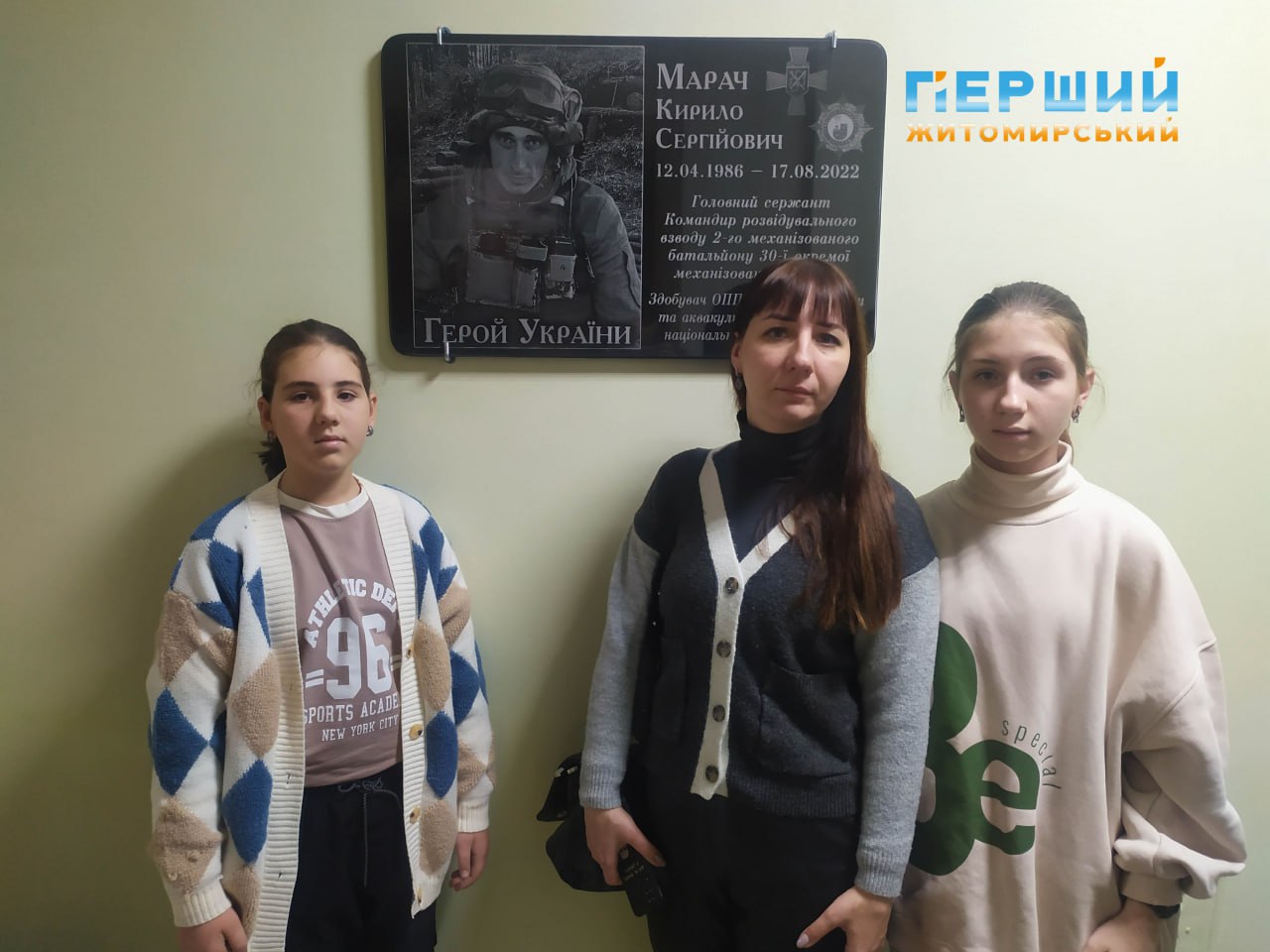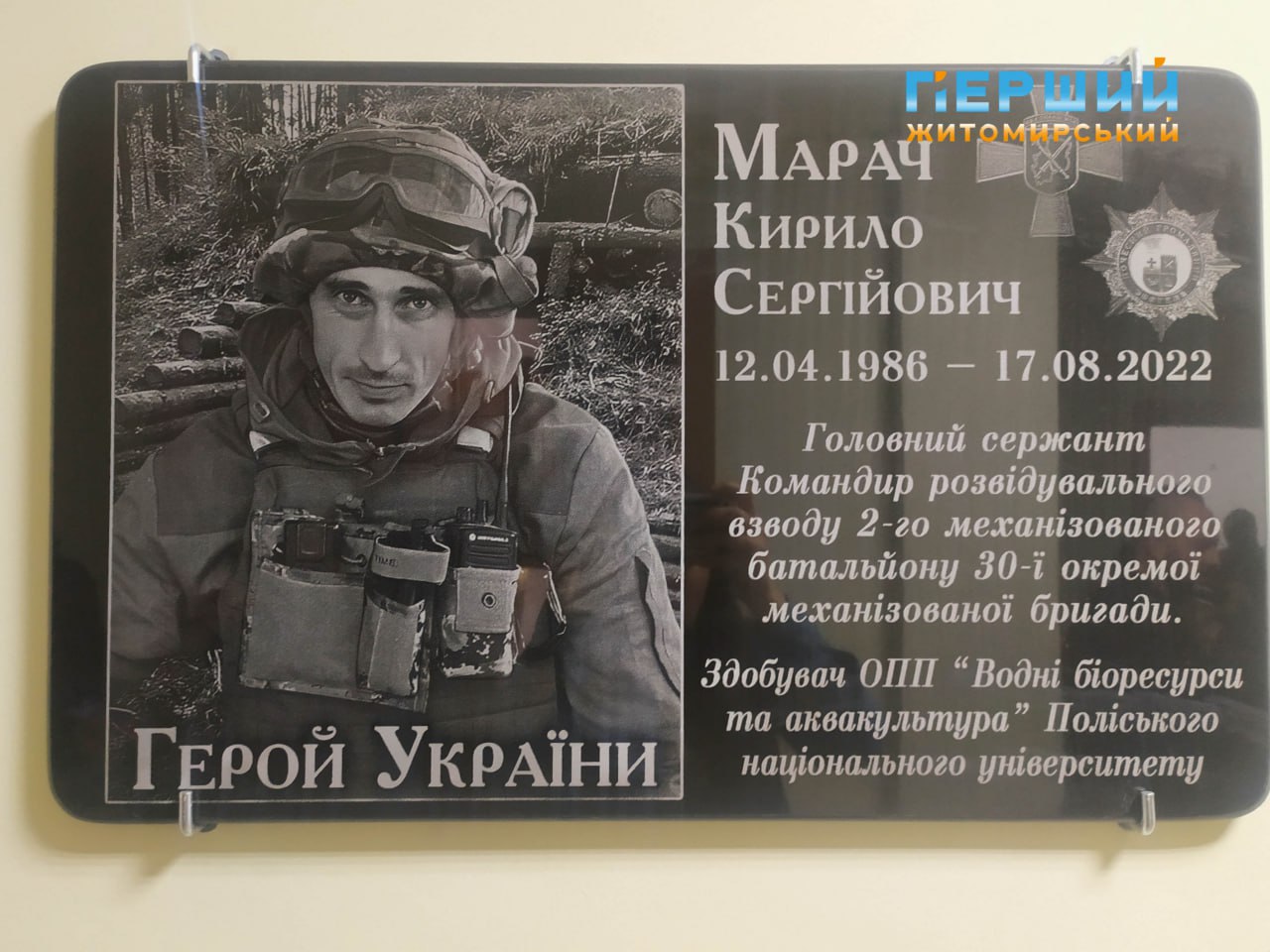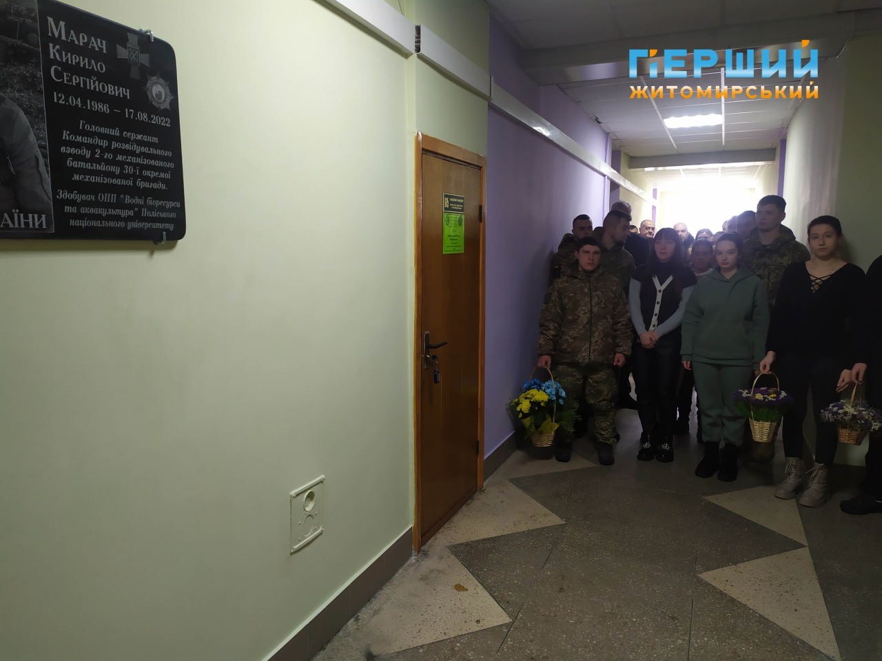 Разом з доньками, побратимами чоловіка та його однокурсниками 5 грудня – напередодні Дня ЗСУ, вона завітала у Поліський національний університет у Житомирі. Кирило був одним зі студентів цього ЗВО, навчався на факультеті лісового господарства та екології, спеціальність “Водні біоресурси та аквакультура”. Саме тут відкрили пам’ятнику дошку загиблому захиснику – головному сержанту, командиру розвідувального взводу 2 механізованого батальйону 30-ї окремої механізованої бригади, Герою України Кирилюк Марачу.