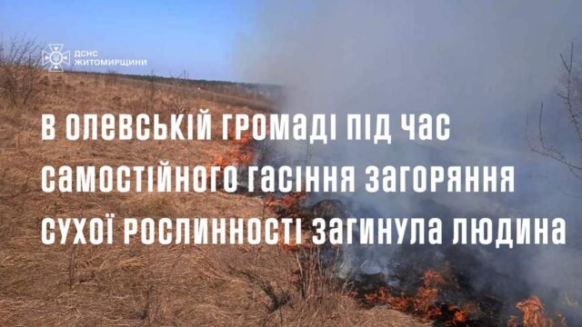 Близько 12 години до Служби порятунку «101» надійшло повідомлення від поліцейських, що у с. Ліски Олевської громади Коростенського району під час самостійного гасіння загоряння сухої трави навколо свого обійстя отримав опіки тіла та загинув 39-річний чоловік.