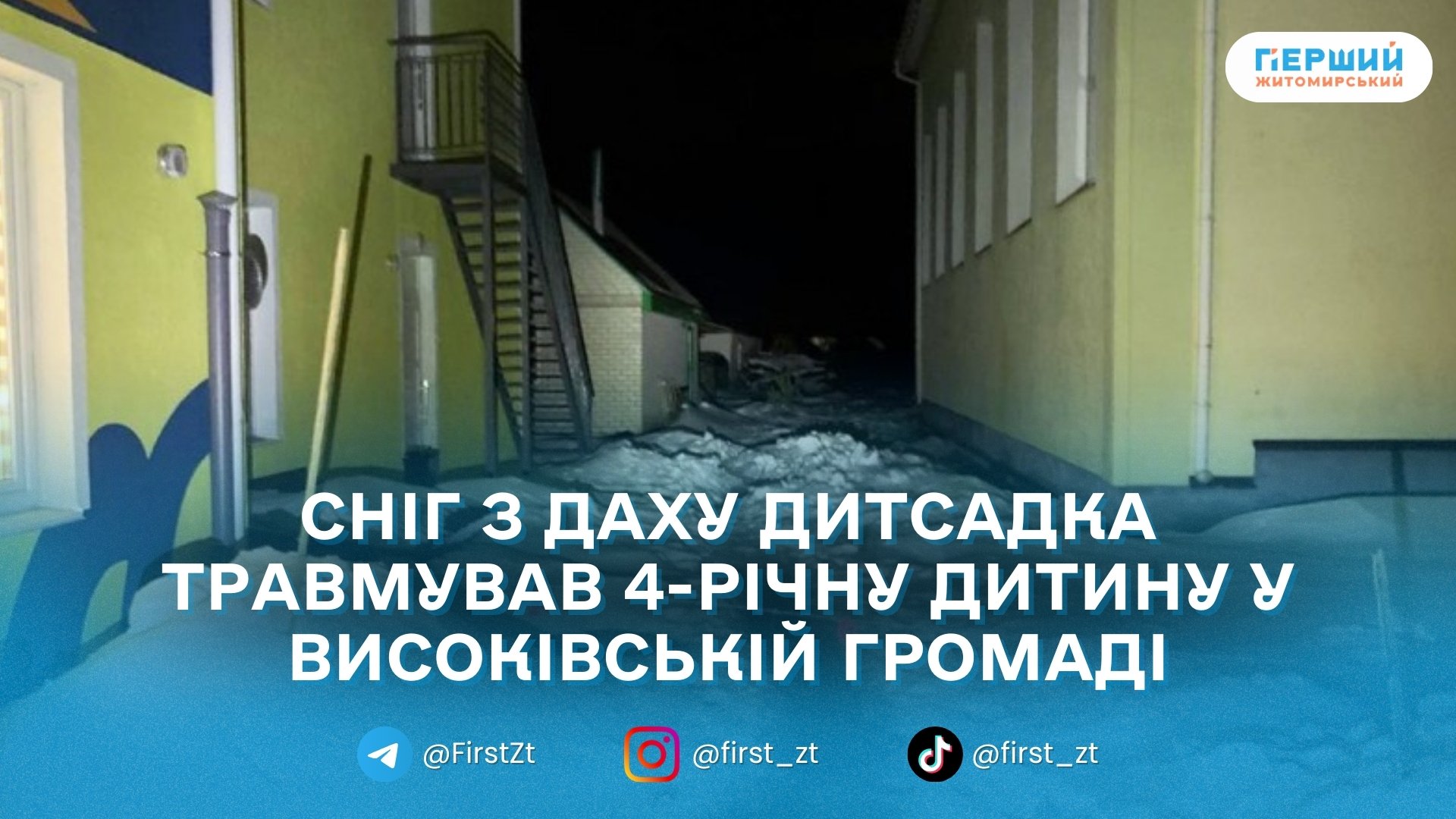 У Житомирському районі внаслідок падіння снігу з даху дитячого закладу освіти травмувалася дитина. Поліція проводить досудове розслідування, повідомили в ГУНП у Житомирській області.