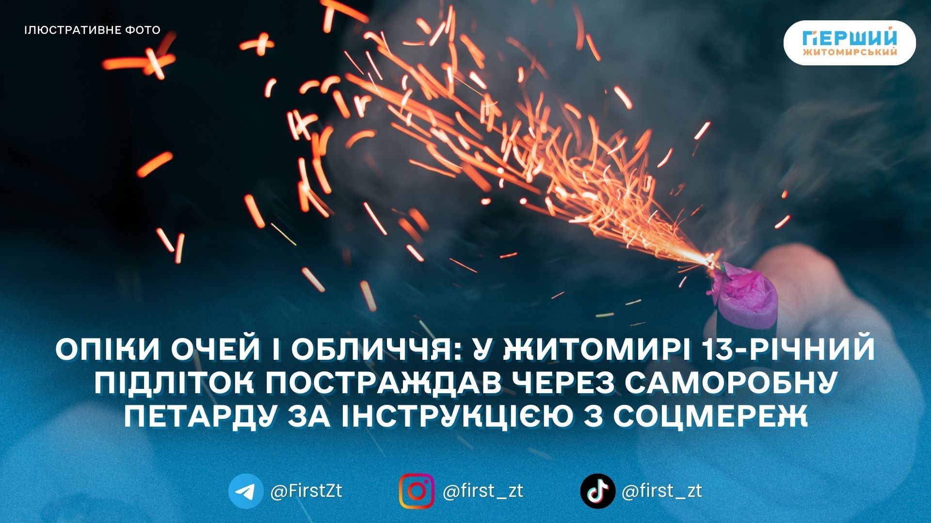 У Житомирі госпіталізували 13-річного хлопця з опіками очей, обличчя та тіла. За словами підлітка, травми він отримав під час виготовлення саморобної петарди за інструкцією із соціальної мережі.