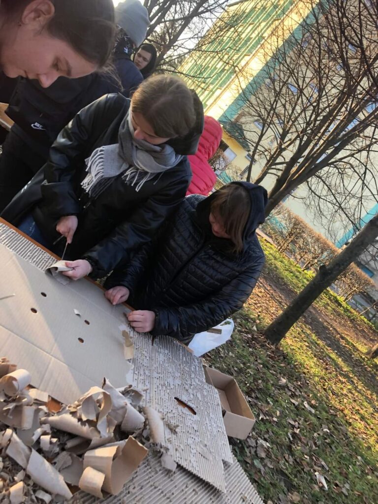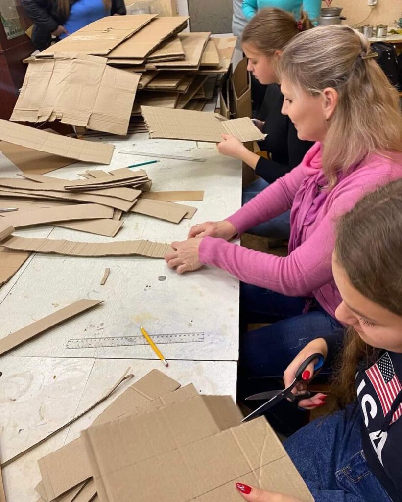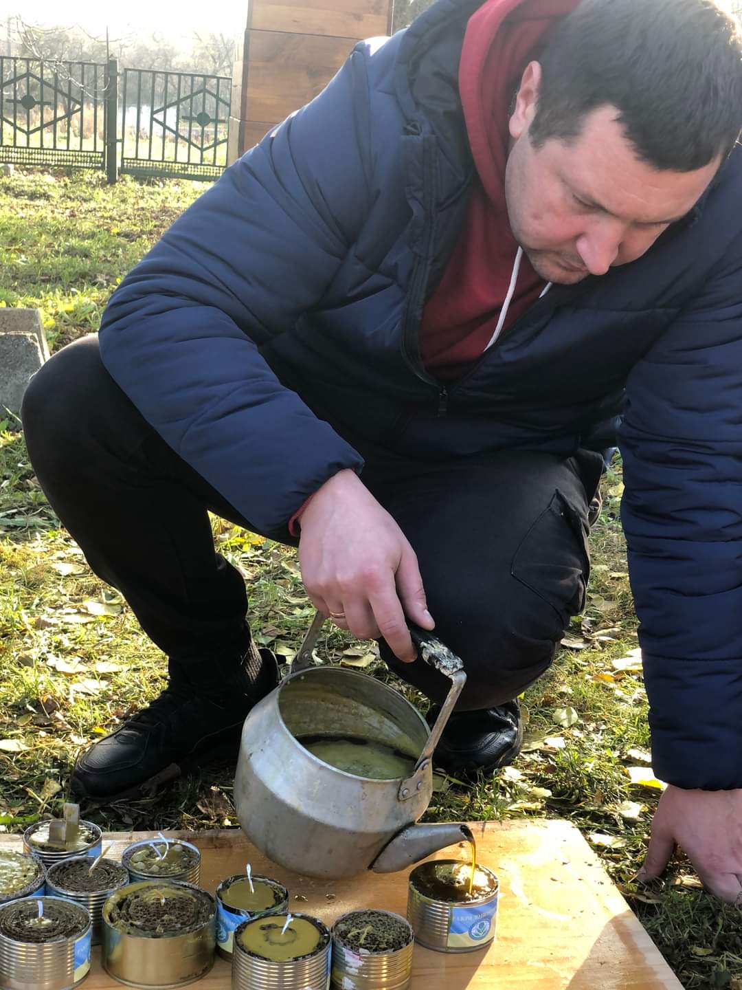 У такій компанії нарізали смужками картон упоперек гофри, шириною трохи меншою, ніж висота банки, скручували його щільно «равликом» і поміщали у ємності, а далі все з чайника заливали розплавленим воском, який для цих потреб надав директор АФ «Бджоловод ЛТД» Юрій Кулаков. На кожній свічці фірмова етикетка «Разом до перемоги» з лототипом Поліського національного університету.