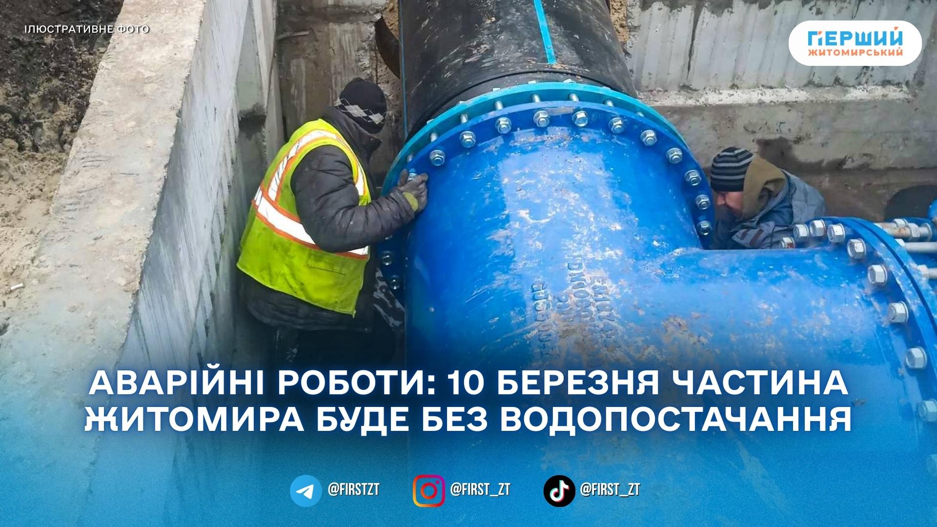 У Житомирі 10 березня тимчасово призупинять водопостачання за низкою адрес через аварійно-відновлювальні роботи. Про це повідомило КП «Житомирводоканал».
