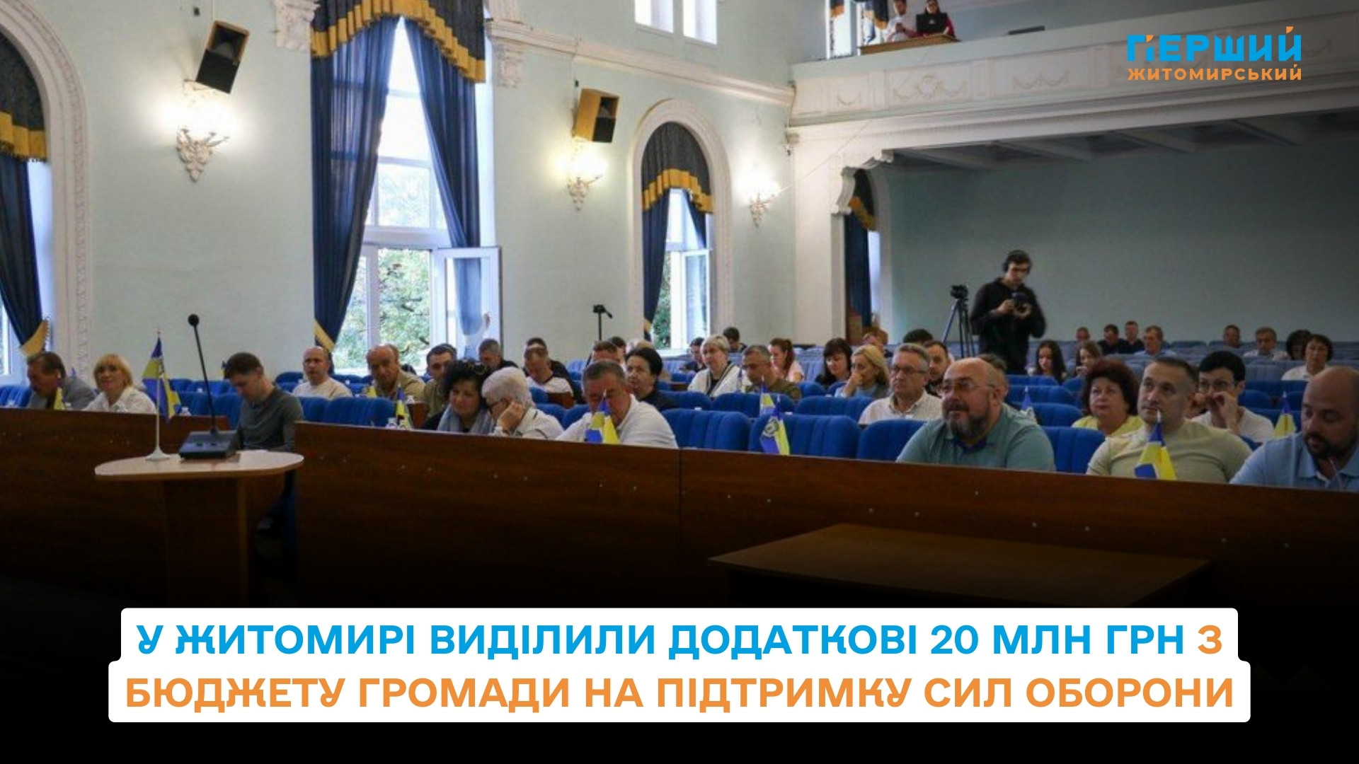 На 55-й позачерговій сесії Житомирської міської ради депутати ухвалили рішення про виділення з бюджету громади додаткових 20 мільйонів гривень на підтримку сил безпеки та оборони. Про це повідомили у Житомирській міськраді.