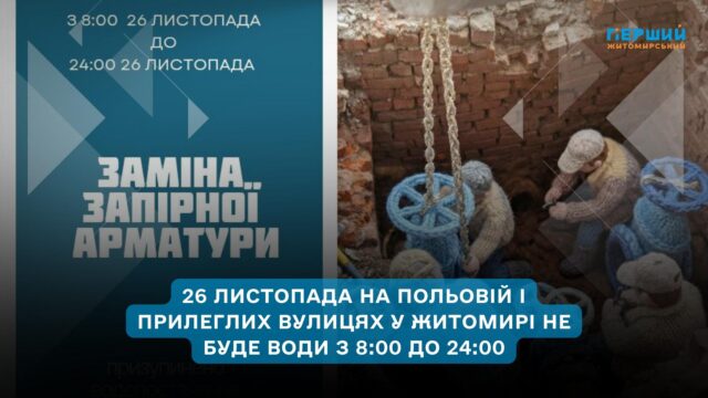 26 листопада в Житомирі частині споживачів тимчасово обмежать водопостачання через роботи з заміни запірної арматури у водопровідних камерах мікрорайону Польова. Про це повідомили в КП «Житомирводоканал».