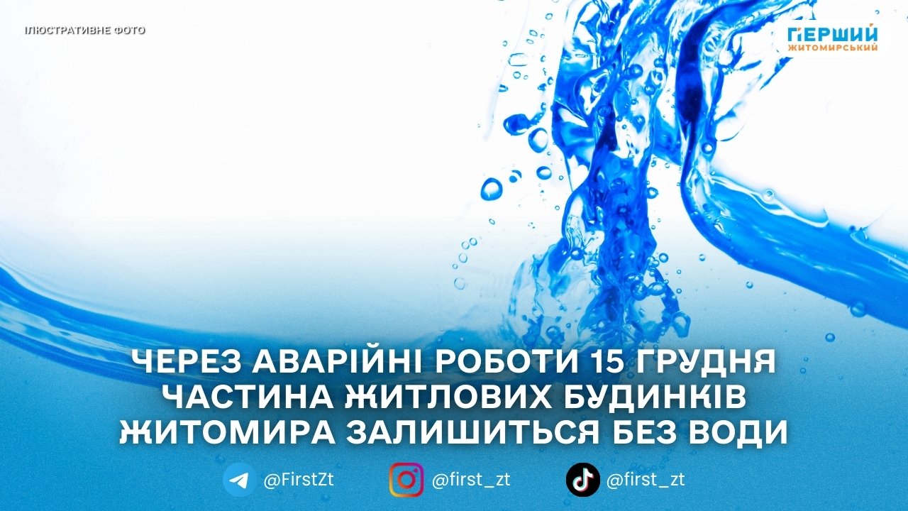 15 грудня у Житомирі тимчасово призупинять водопостачання за низкою адрес через проведення аварійно-відновлювальних робіт. Про це повідомили в комунальному підприємстві «Житомирводоканал».
