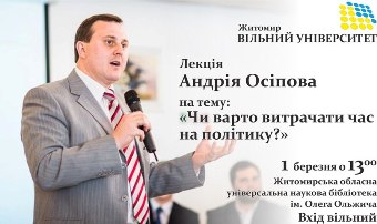 Лекцію на тему: «Чи варто витрачати час на політику» в Житомирі для слухачів Вільного університету читатиме адвокат, експерт Інституту політичної освіти, голова громадської організації «Луцькі дороги», депутат Луцької міської ради VI скликання Андрій Осіпов.
