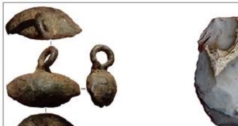 Археологічні знахідки виявлені в історичній частині м. Житомира упродовж 2016 року: 1 – Бубонець (дзвіночок), 2 – Крем’яний скребок, 3 – Свинцева князівська печатка ХІІ ст., 4 – Польська срібна монета півгрош 1626 р.