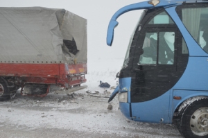 Відтак, на ділянці об’їзної дороги в Коростишівському районі на засніженій дорозі автобус занесло на вантажівку «Рено-Преміум», яка стояла з правого боку проїзної частини. Внаслідок дорожньо-транспортної пригоди постраждало двоє пасажирів автобуса, яких з отриманими тілесними ушкодженнями різного ступеню тяжкості було госпіталізовано.