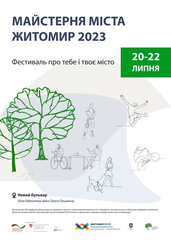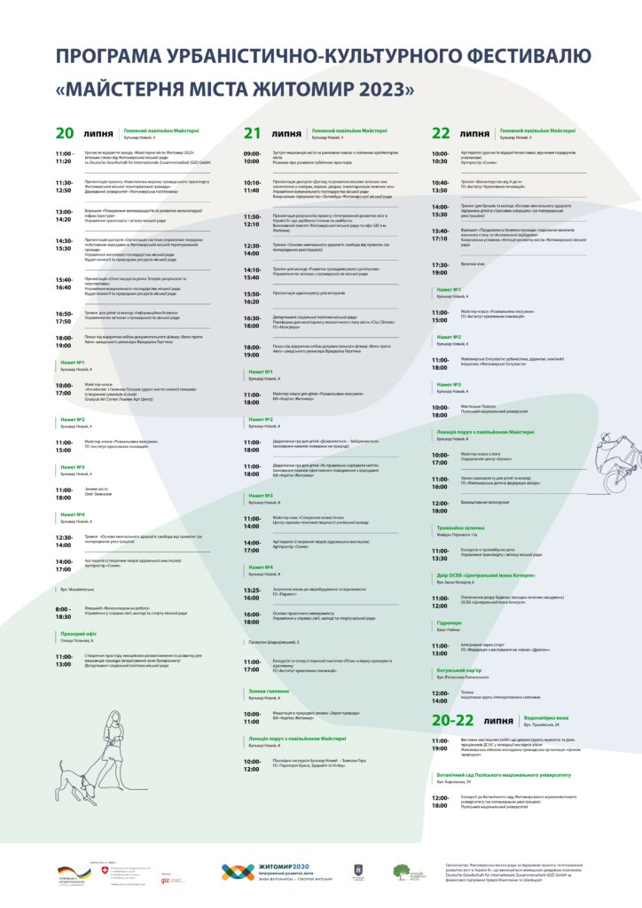 У Житомирі 20-22 липня пройде щорічний фестиваль “Майстерня міста”. Цьогоріч у програмі понад 40 заходів – презентації міських проєктів, дискусії, обговорення на теми міського розвитку, урбан-дослідження, тренінги з підтримки ментального здоров’я, арттерапія, майстеркласи з йоги, виставки мистецьких робіт та ігри.