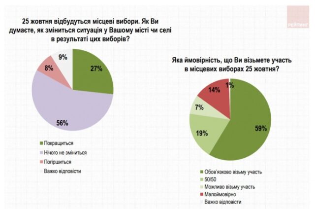 За результатами соціологічного опитування, 59% українців планують брати участь у місцевих виборах, при цьому 56% опитаних вважають, що після виборів ситуація у їхньому місті не зміниться.