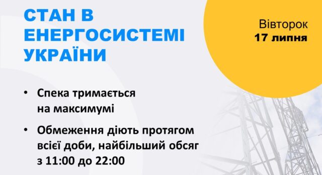 Сьогодні, 17 липня, обленерго застосовують обмеження споживання протягом всієї доби. За прогнозом, сьогодні спека утримається на максимальному рівні, що призведе до рекордного споживання, яке суттєво перевищує можливості українських електростанцій. З 11:00 до 22:00 діятимуть чотири черги відключень, з 22:00 до 24:00 – три черги.