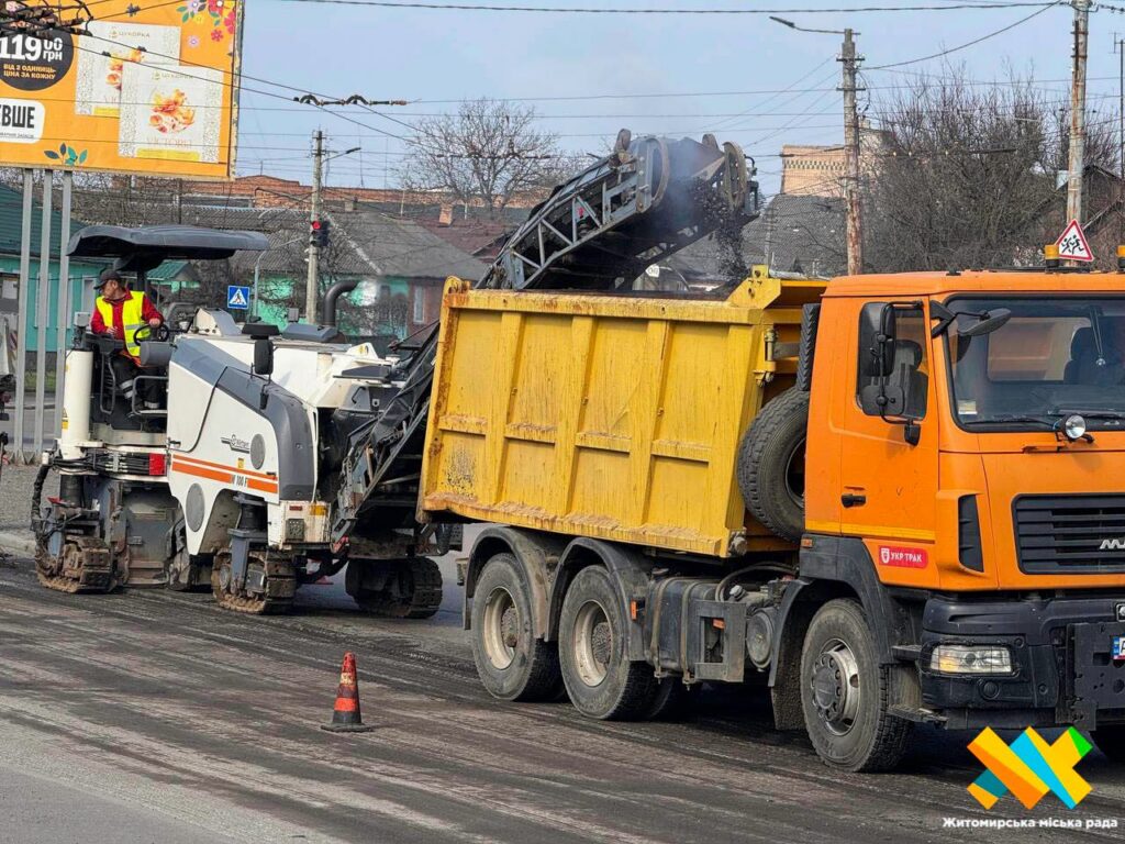 Сьогодні, 1 квітня, ремонтники працюють на Великій Бердичівській — на відрізку від вулиці Жуйка до Смолянського цвинтаря. Там задіяна дорожня фреза для зняття пошкодженого верхнього шару асфальтобетону та вирівнювання поверхні.