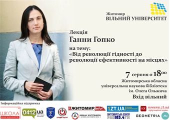 7 серпня в рамках проекту «Вільний університет» лекцію на тему «Від революції гідності до революції ефективності на місцях» прочитає громадська активістка Ганна Гопко.