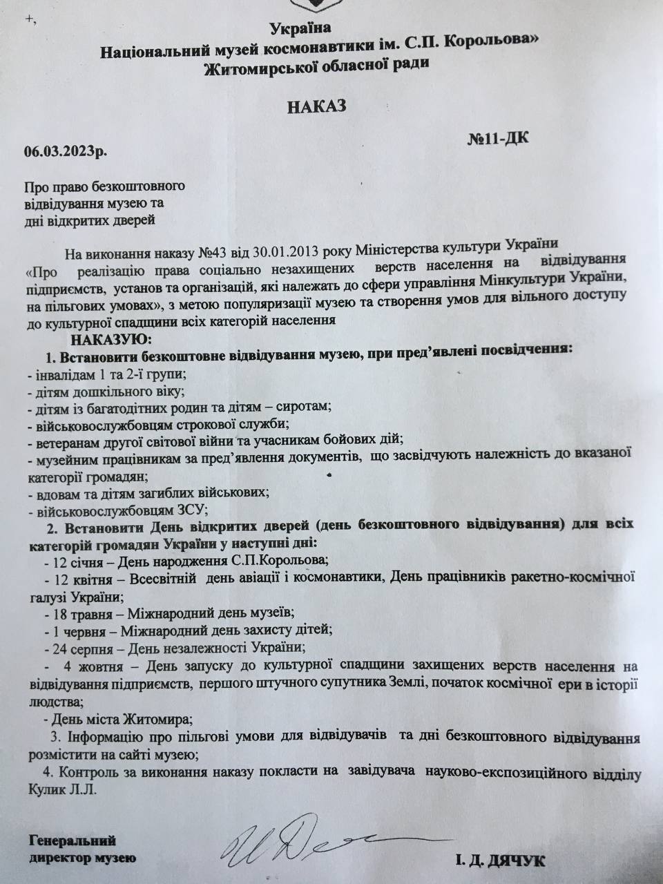 У розпорядження редакції потрапив наказ Національного музею космонавтики ім. С. П. Корольова «Про право безкоштовного відвідування музею та дні відкритих дверей», підписаний Генеральним директором Іриною Дячук.