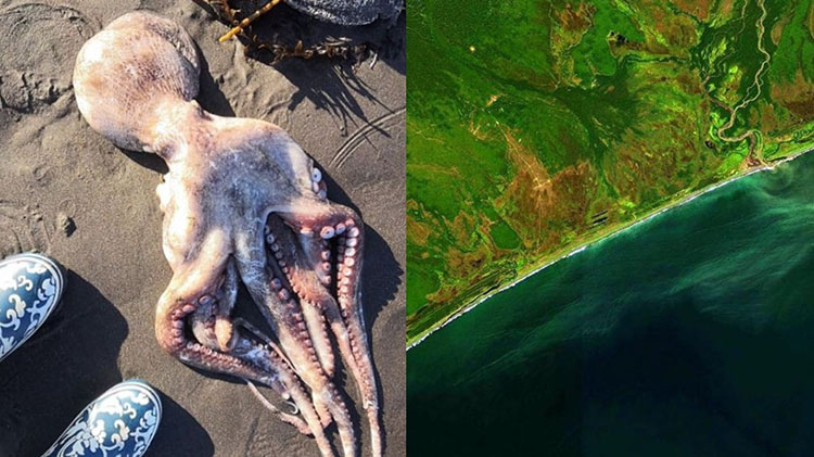 У соцмережах опубліковані численні фото та відео берега, засіяного мертвими морськими зірками, морськими їжаками, рибою, крабами і навіть восьминогами.