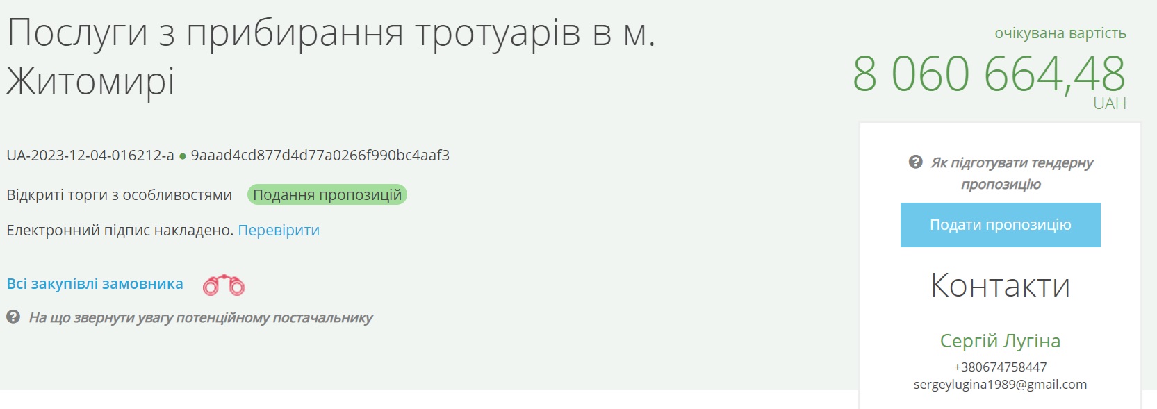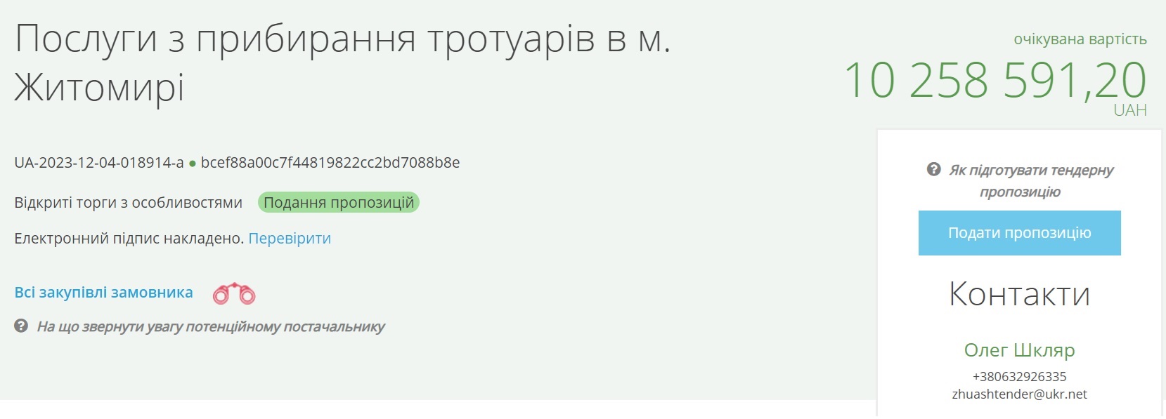 Комунальне підприємство “Управління автомобільних шляхів” 4 грудня оголосило два тендери на прибирання тротуарів у Житомирі на 2024 рік. Згідно з порталом Prozzoro загальна сума закупівлі складає приблизно 18 мільйонів 319 тисяч 255 гривень 68 копійок. Один з тендерів вартує 8 060 664,48 гривень, з мінімальним кроком пониження ціни у 40 тисяч 303 гривні 32 копійки, вартість іншого ж – 10 258 591,20 гривень, з розміром кроку у 51 тисячу 292 гривні 96 копійок. Оскарження умов закупівлі обидвох тендерів триватиме до 9 грудня, аукціони стартують 12 грудня.