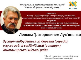 Завтра, 23 березня, в Житомирі буде легендарний політик, справжній Герой України – Левко Лук’яненко. Зустрітись з ним і послухати можна буде о 16:00 журналістам в Телецентрі та всім бажаючим о 17:00 в залі засідань міськради.