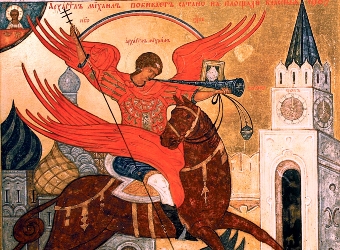 Починаючи від Мономаховичів (1125 р.), київські князі вважали Михаїла своїм покровителем, зображали його на стародавніх гербах Києва. Символ Михаїла присутній і на головній хоругві часів Богдана Хмельницького та на численних козацьких прапорах.