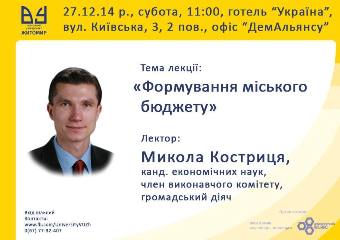 Кандидат економічних наук, член виконавчого комітету Житомирської міської ради Микола Костриця для житомирян прочитає лекцію на тему: "Формування міського бюджету".
