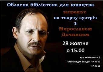 В обласній бібліотеці для юнацтва 28 жовтня о 15.00 відбудеться творча зустріч письменника Мирослава Дочинця.