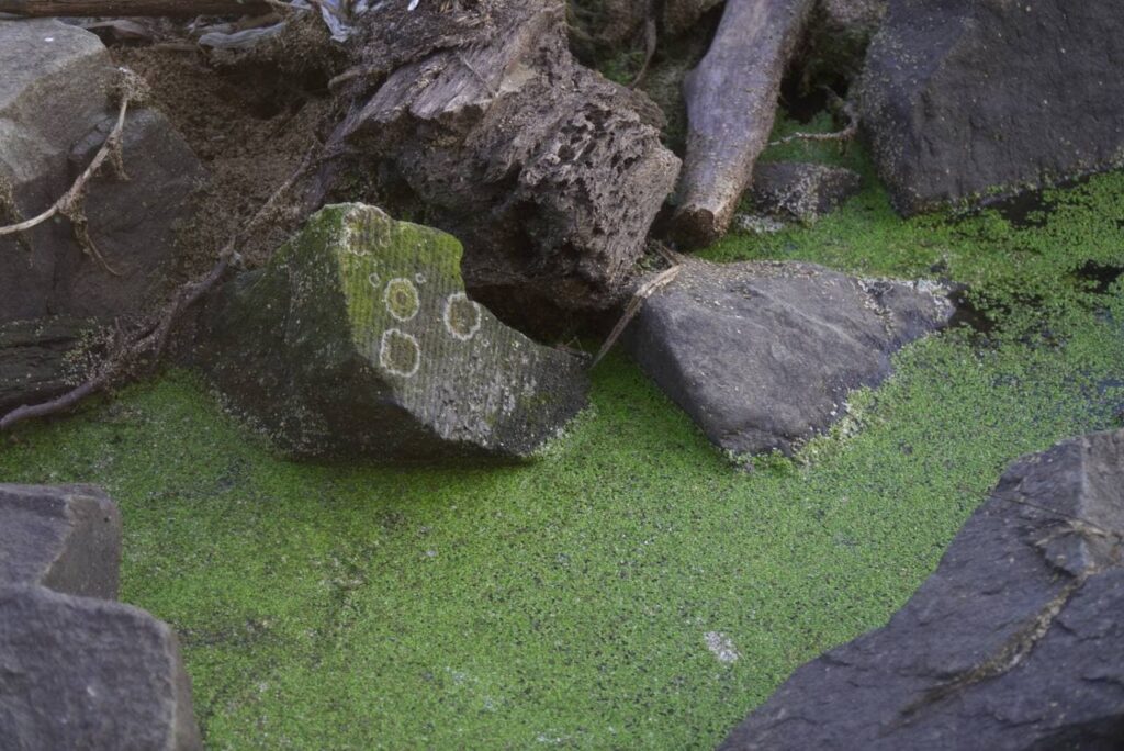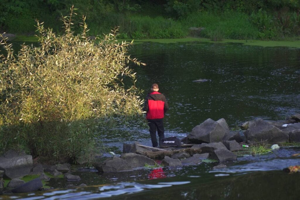 На місці забруднення вода й досі зелена. Біля річки сидять рибалки.