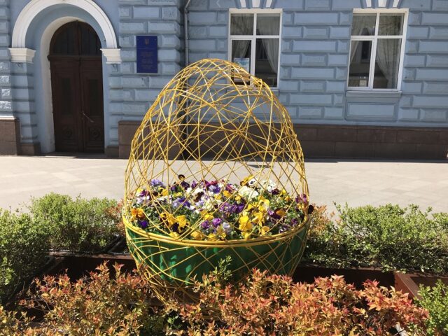 По 50-60 кущів різнокольорових квітів – віоли – висадили працівники КП" Зеленбуд" у конструкції великодніх яєць на Михайлівській.
