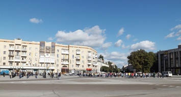 Паралельно прикрашають фасад драмтеатру спеціальними конструкціями до завтрашніх урочистостей, а працівники магазинів та аптеки що знаходяться по периметру Соборного, підфарбовують стіни своїх закладів "рівно з вікнами".