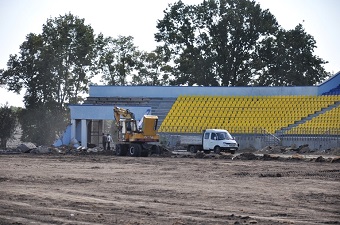 Наразі демонтовано старе покриття футбольного поля та бігових доріжок.