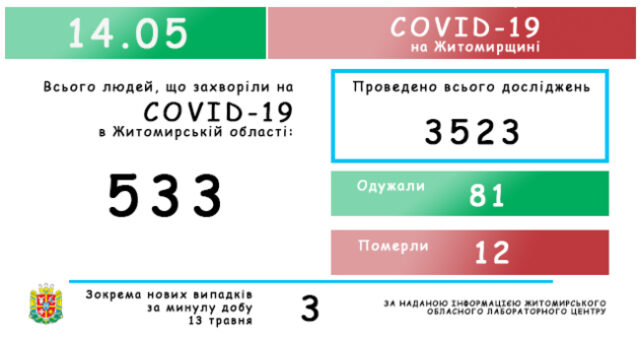 За даними Житомирського обласного лабораторного центру станом на 09:00 14.05.2020 (за минулу добу – 13 травня) зареєстровано нових лабораторно підтверджених випадків – 3.