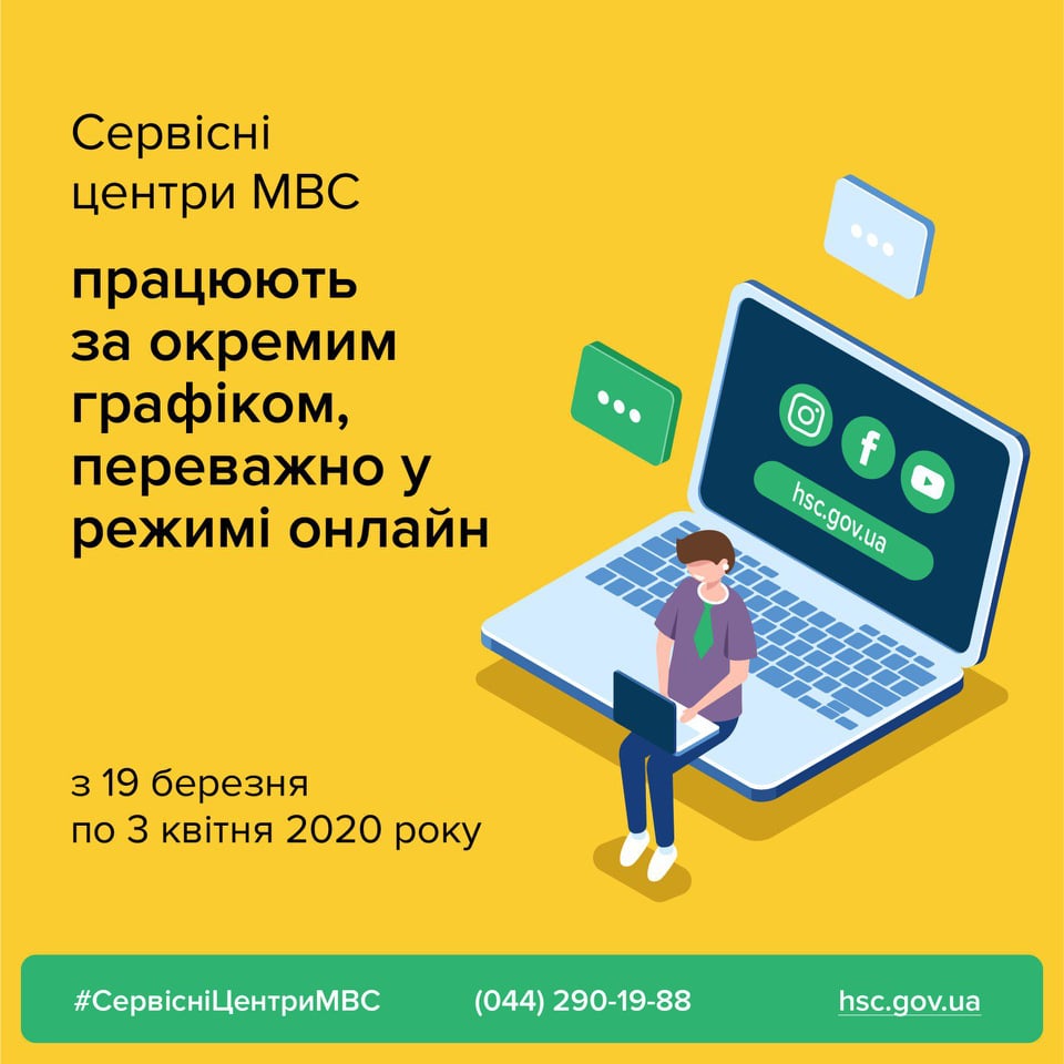 З 19 березня до 3 квітня 2020 року сервісні центри МВС тимчасово зупиняють прийом громадян і працюють за окремим графіком, переважно в режимі онлайн.