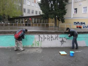 Навіть несприятлива погода не стала на заваді активістам. Менш ніж за годину фонтан, який за час революції розмалювали різними написами, набув охайного вигляду.