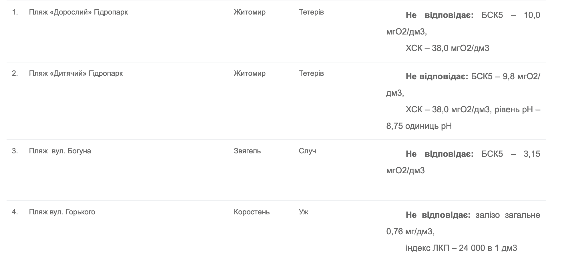 Зокрема, в Житомирі на дорослому та дитячому пляжах у Гідропарку вода в межах норми, проте перевищені показники хімічного та біологічного споживання кисню.