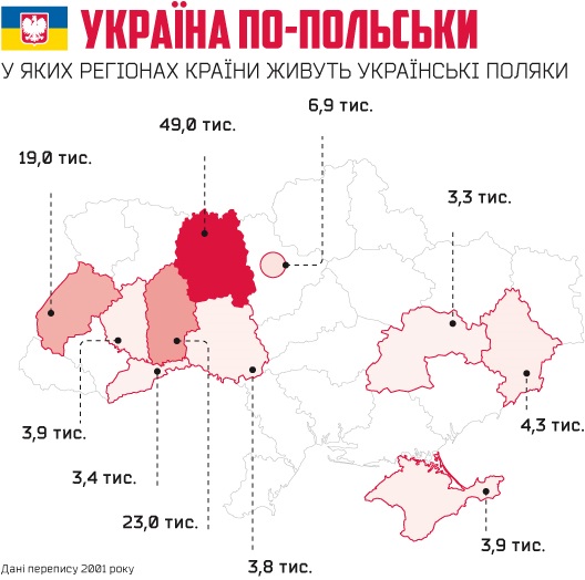 Згідно з переписом населення 2001 року, 71% поляків України назвали своєю рідною мовою українську, 16% – російську і тільки 13% – польську. У порівнянні з переписом 1989-го кількість поляків скоротилася більш ніж на третину – сьогодні їх 112 тис., або 0,3% жителів країни. Вони представлені практично у всіх регіонах, але традиційна смуга їхнього розселення – від Житомира до Львова.
