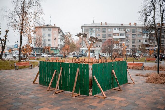 У реконструйованому сквері на вулиці Лятошинського вже почали встановлювати фонтан «Лотос Небесної Сотні».