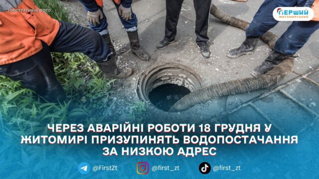 18 грудня у Житомирі через проведення аварійно-відновлювальних робіт призупинять водопостачання за низкою адрес, повідомили в КП «Житомирводоканал».