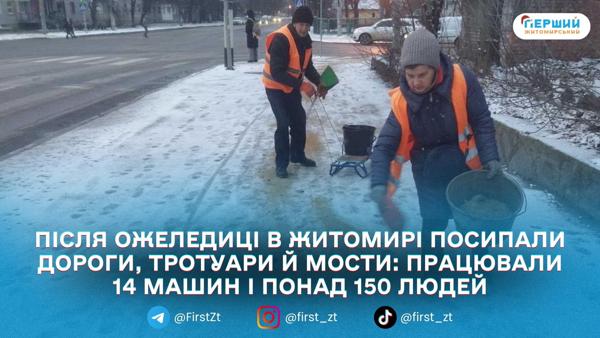 У Житомирі із вечора 23 грудня комунальні служби розпочали протиожеледну обробку вулиць та тротуарів. Для робіт залучили 14 одиниць спецтехніки та понад 150 працівників. Про це повідомили в ЖМР.