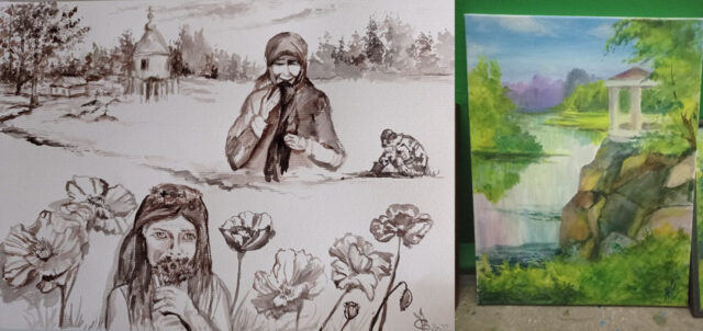 “До 24-лютого малювали ліричні малюнки, а після війни про розпач та горе людей. Картину, яка переповідає суть війни намалювала в сірих тонах: мати плаче, а зверху солдат молодий, поруч маленька дівчинка у квітах, яка все це бачить. Це мої відображення стану моєї душі. Також є картина, де чоловіча нога в капцях “руських” нищить український дім”, – із сумом говорить художниця.
