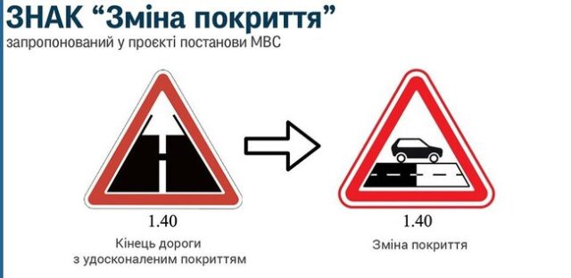 Може змінитися вигляд одного з дорожніх знаків, 1.40 "Кінець дороги з удосконаленим покриттям". У новому варіанті дорога буде зображена не в перспективі, а горизонтально, і над нею з’явиться силует автомобіля. Назва знака теж запропонована інша: "Зміна покриття".