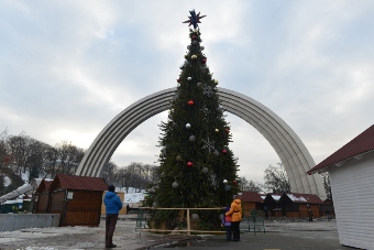 Київ відзначатиме Новий рік з натуральної ялинкою. Деревця для столичної красуні привезли з Житомирської області. Дерево встановили під аркою Дружби народів і вже прикрасили. На ньому висить кілька десятків різнокольорових кульок великого розміру і гірлянди. Залишилося тільки облагородити огорожу.