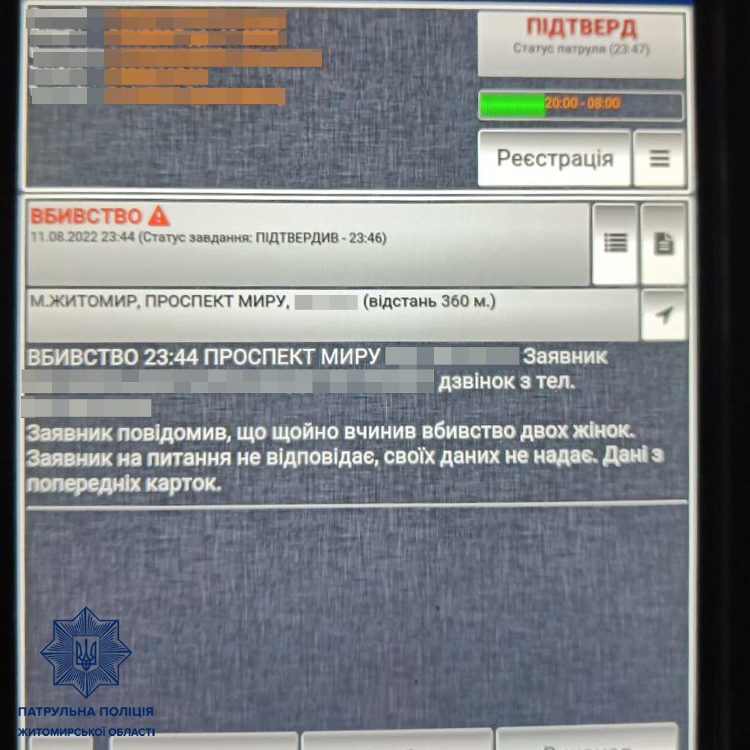 Вночі житомирянин набрав у поліцію та повідомив про подвійне вбивство двох жінок. Поліцейські швидко відреагували та приїхали на місце події.
