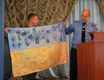 Начальник УМВС області Валерій Рудик передав командиру зведеного загону український прапор з відбитками долонь маленьких житомирян, виготовлений ними під час занять у місцевому дитячому центрі. За побажанням дітлахів міліціонери встановлять прапор на найвищій точці у місці дислокації полісян.