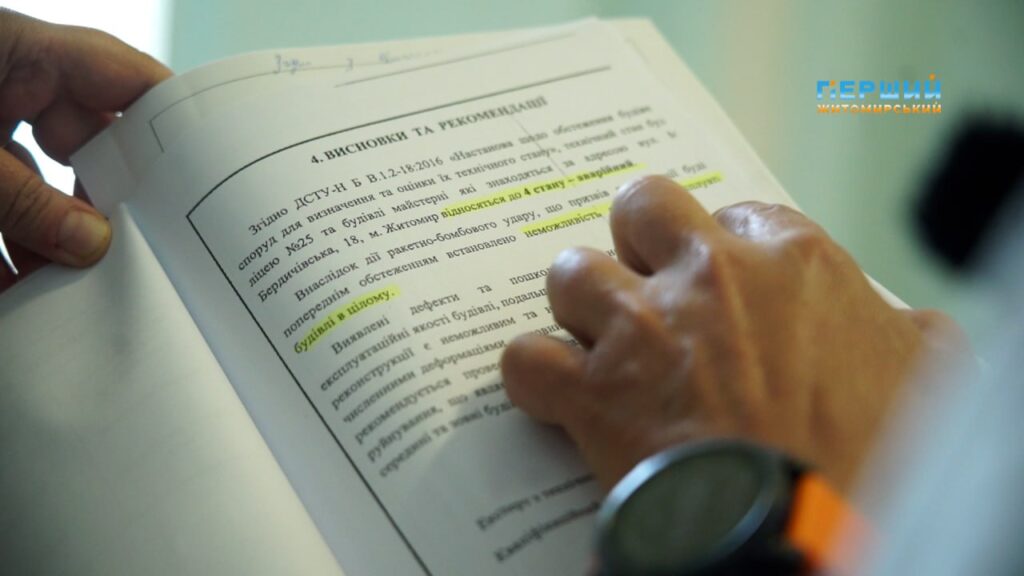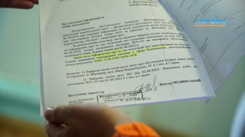 Сергій Сухомлин, міський голова Житомира, каже, що згідно з двома державними експертизами, проведеними у 2022 та 2023 роках, будівля 25 ліцею була визнана аварійною і не підлягає відновленню. Він стверджує, що не знає про існування висновків експертизи, де зазначалося б, що відновлення ліцею є можливим.