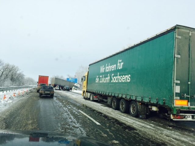 Заледеніла дорога, майже не посипана. Прикро. Я знаю, що й тут дорожники також дуже важко працюють, та для третього дню після сніжної стихії – це не найкращий показник. Керівник облавтодору жаліється: люди дуже втомлені, техніки бракує, 30% від усієї, що є в наявності, зламалося. Ось Вам і приклад, чому нам так необхідно закупити оновлену техніку.