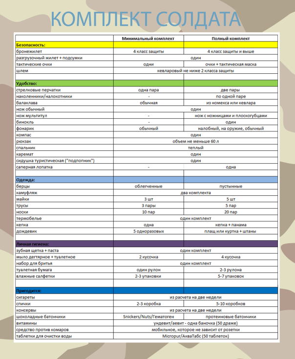 Нижче повний список необхідних у зоні АТО речей. Він складений за інформацією, отриманою від волонтерів, які допомагають військовим, самих бійців. Аптечку допомагали складати провізори-волонтери.